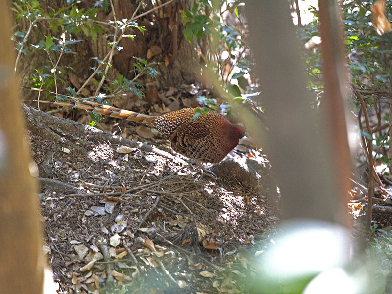 高尾山3号路の中間付近を歩いている時、がさごそと音がするのでその方向へ目をやると採餌中のヤマドリがいた。ヤマドリもこちらに気づいたようで採餌をやめ窺っているようなしぐさをしていた。