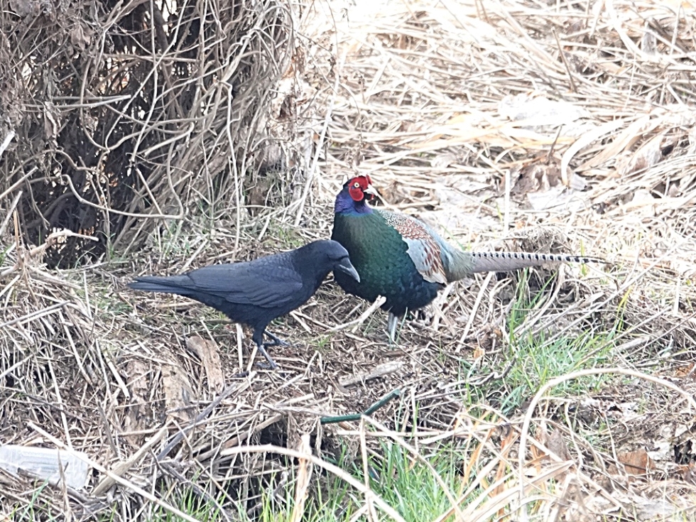 | 仲良し? 冬鳥調査にて。キジ(オス)がハシボソガラスに近寄ってきて、しばらく一緒にいて餌をとったりしていた。特に争う様子もなく、むしろ仲良くしているように見えた。しばらくして、別のハシボソガラスが近寄ってくると、キジと一緒にいたハシボソガラスはキジから離れていった。 撮影場所:浅川 大和田橋下流左岸 撮影日:2020.1.12 撮影者:佐藤哲郎 |