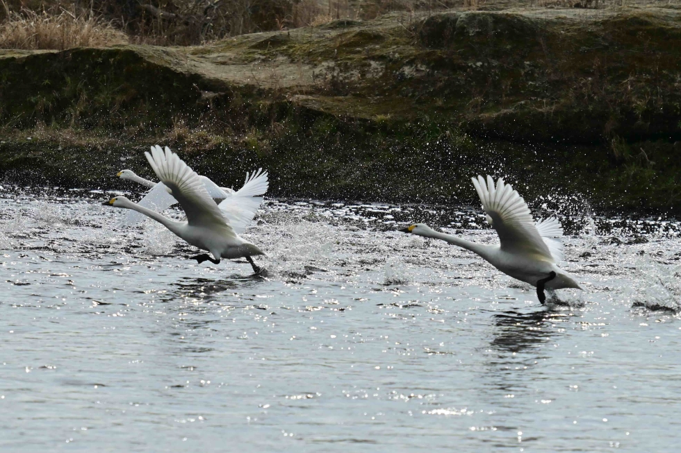 | ハクチョウの飛び立ちの合図 じっとしていた鳥が飛び立つ際には、羽繕いを始めたり、鳴き始めるなど、何らかのサインがありますが、このハクチョウたちは急に横一列に並び、小さな声で意思確認なのか鳴き交わしをして、その後いっせいに飛び立ちました。ほんの200から300m下流へ行っただけですが。 撮影場所:多摩川 多摩大橋下流 撮影日:2022.1.29 撮影者:小川圭太 |