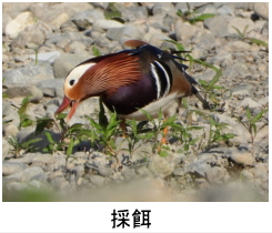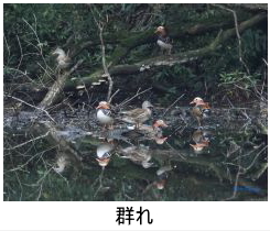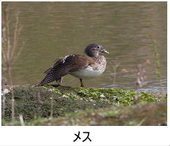 解説:オシドリはオスの華麗な出で立ちでよく知られる。メスは対照的に地味であるが、胴体の白斑と目の後方の明瞭な白線で、他のカモのメスとの識別は容易である。当地ではなかなか見ることが難しいが、近年、丘陵地にある都市公園の池や団地の調整池等での観察例が増えている。