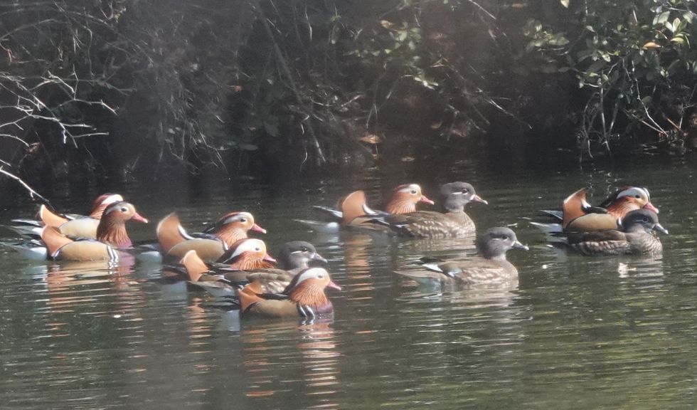 池にはマガモ、オカヨシガモに混じりオシドリが10羽以上いた。