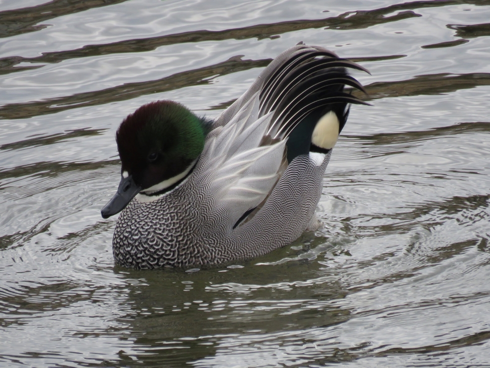 越冬中9羽のヨシガモのうち、オス4羽が求愛ディプレイのような行動をしていた。