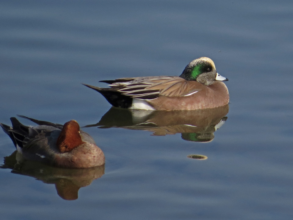 | 久しぶりのアメリカヒドリ ヒドリガモ14羽が水面で体に頭を埋めて睡眠をとっていた。やがて眼をさまし周りの草を食べ始めた。そのうちの1羽がアメリカヒドリと気付いた。このあたりではいつもコガモ、ヒドリガモ、カルガモしか見かけなかったので久しぶりの出会いに感激。 撮影場所:浅川左岸・平山橋至近の水門 撮影日:2014.1.14 撮影者:岡本昭男・昭子 |