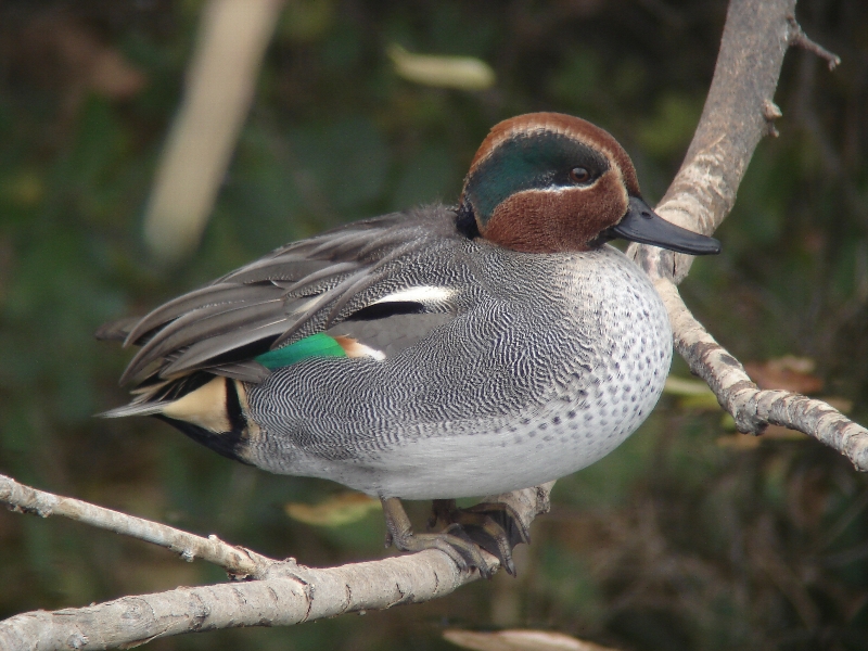 枝の上で休息中のコガモ(オス)。目から側頭部にかけての帯は暗緑色、時には濃紺に見える。