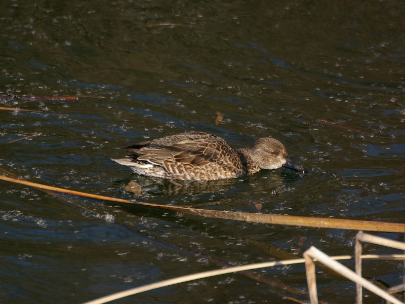 水面に散った種子を食べるコガモ(メス)。クチバシを水面と水平にしてすくい取るように食べる。