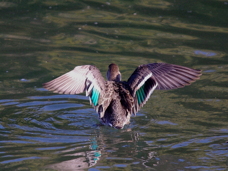 コガモ(メス)が羽を広げたところを真後ろから撮った。雨覆いや風切羽の構造がよくわかる。羽を閉じたときに脇腹後方にみえる青緑色の翼鏡は、次列風切の部分にある。