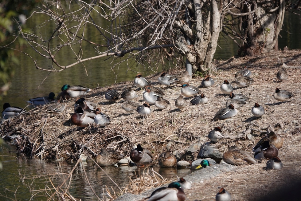 毎年コガモが越冬している。この日は130羽、他にオカヨシガモ20,ヨシガモ2,マガモ70,カルガモ2,ホシハジロ3もいた。