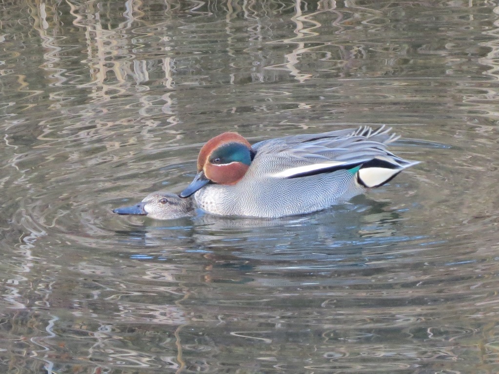 この寒い時期にコガモの交尾を観察しました。妙な雰囲気のオス・メス2羽のコガモが3〜4秒間のマウント終了後にメスが翼を羽ばたかせたのが印象的でした。