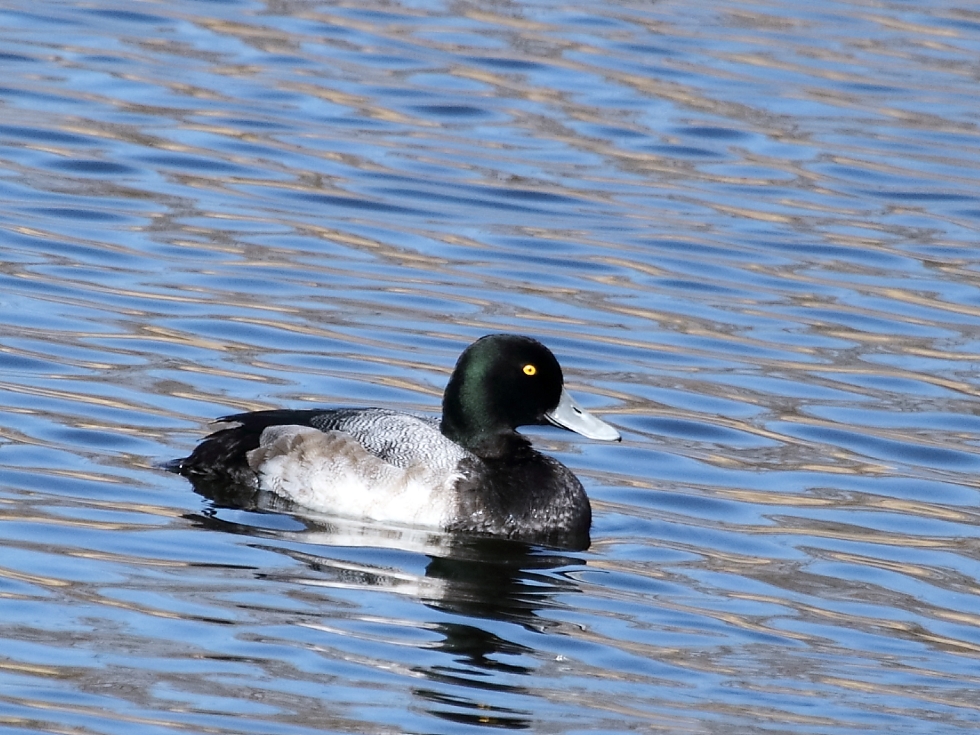 キンクロハジロかと思ったが、頭が緑がかった黒で、スズガモと判断しました。オオバン、カイツブリと一緒に潜って採餌していた。
