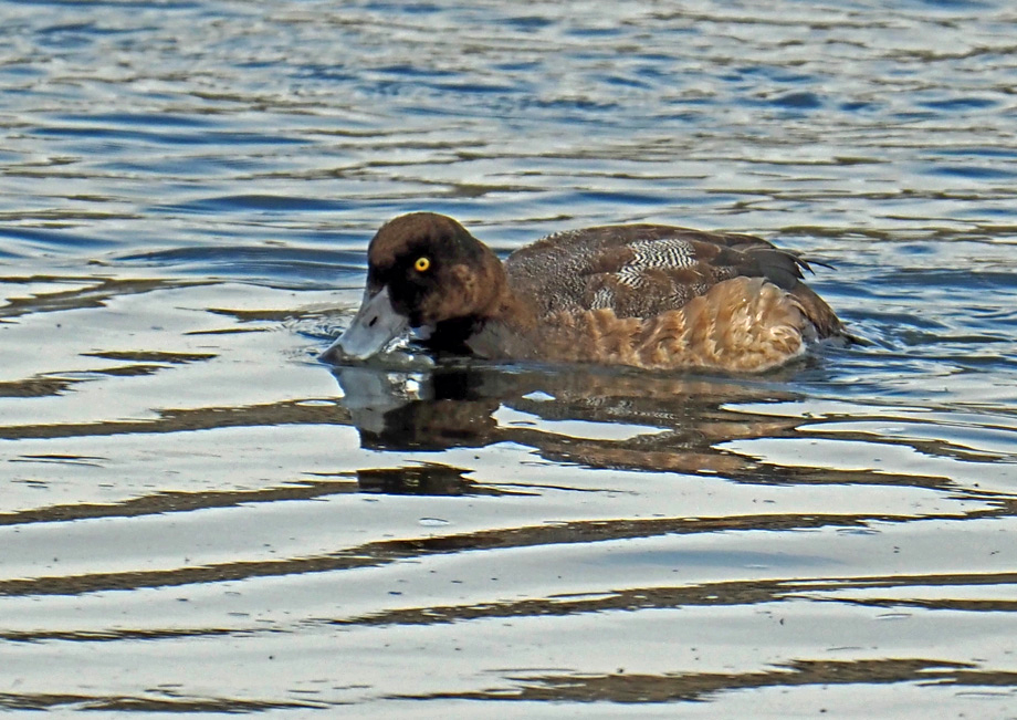 2羽のカイツブリの近くで大き目のカモが泳ぎながら採餌していた。撮影して拡大してみると幼羽があちこちと抜け始め、その下からスズガモ・オスの特徴的な羽が覗いていた。時期的にエクリプスとは考えられないので若とした。