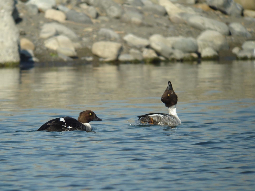 胸も白く、目先の下にうっすら白斑があるので「オス1年目冬」の個体のようです。求愛行動(頭を後ろに反らす)も見られました。