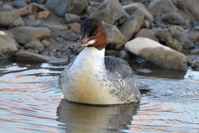 川幅が狭く人間との距離が近いせいで落着きが無かった。ウミアイサと似ているが上嘴先端が下に曲がっているので容易に判別できる。この付近で見るのは珍しいと思います。