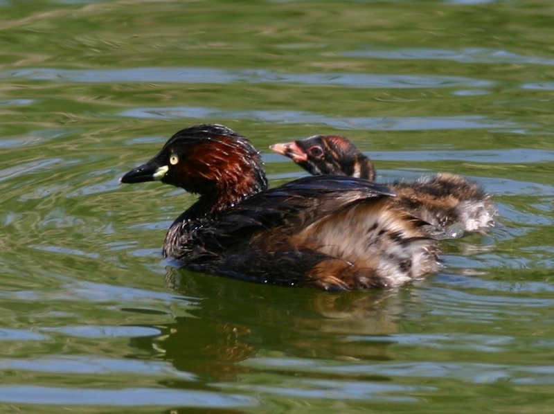 カイツブリは当地で繁殖もしています。親は夏羽です。
