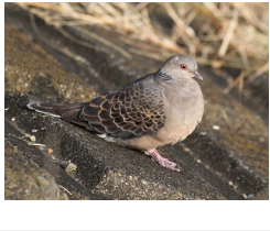 解説:当地ではほぼ全域で普通に見られるハトであるが、1羽または数羽で見られることが多く、カワラバト(ドバト)のように大群になることはない。繁殖期には「デデポッポー」という特徴的な声で繰り返し鳴く。羽のうろこ模様が特徴的で、首には灰褐色の横班がある。体は全体的にぶどう色がかった灰褐色である。