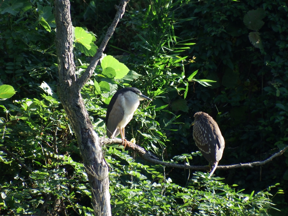 池近くの木の枝にとまった成鳥と幼鳥。親子だろうか?