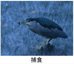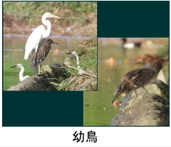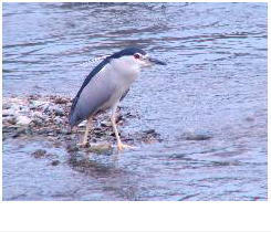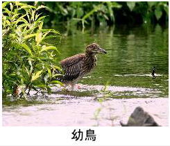 解説: 留鳥であるが、数は多くない。英名は"Night Heron"であり、基本的には夜行性で昼間は川岸の灌木の中などでじっとしていることが多い。成鳥は頭から背中が紺色で幼鳥は褐色で翼には一面に灰白色の斑点があり、「ホシゴイ」とも呼ばれる。