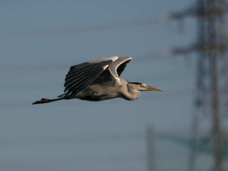 ほぼ真横から捉えたアオサギの飛翔。この姿勢で時々糞をすることがある。