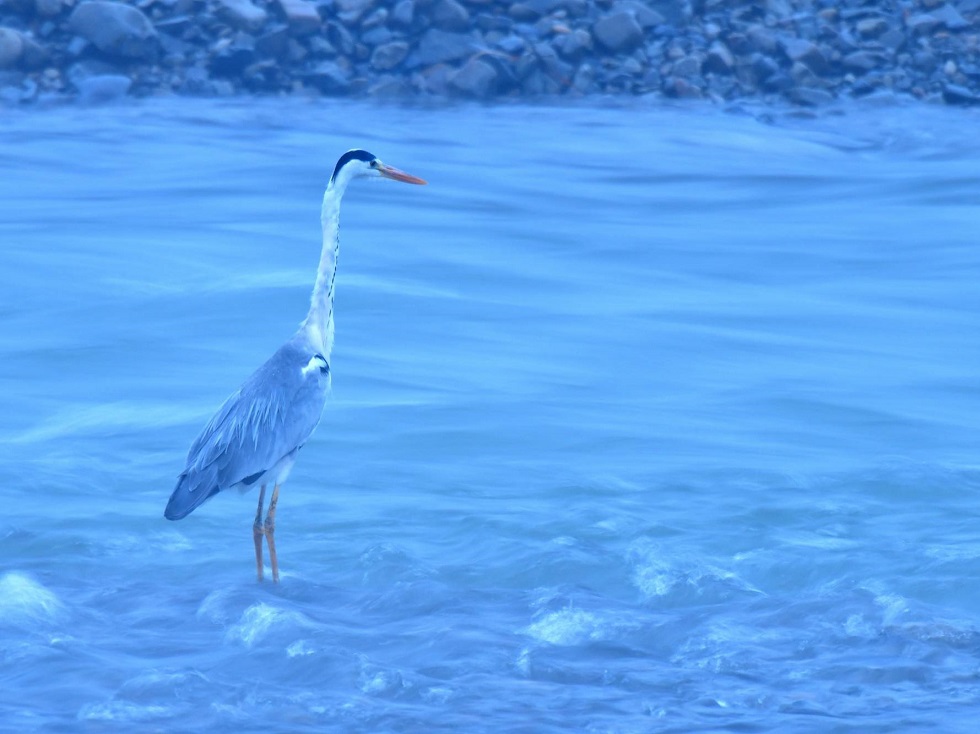 水かさが増した川で、じっと獲物を待つアオサギが修行僧のようでした。