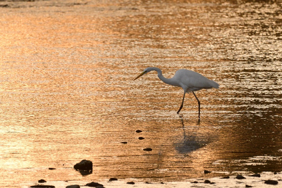 日没の光が水面を金色に照らした一瞬に、一羽のダイサギが歩みを進める姿が印象的でした。
