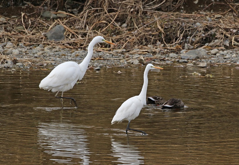 左が亜種ダイサギ、右が亜種チュウダイサギ。大きさや足色の違いで別亜種と判断しました。先月(1/26)も同一場所で同一個体と思われる2羽を観察しましたので、亜種チュウダイサギも越冬しているものと思われます。