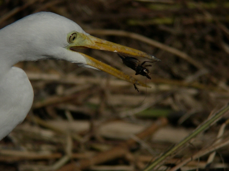 台風による増水の後、水の引いた河原で、チュウサギがなぎ倒された草の下のトカゲや昆虫類を捕食していた。このようにコオロギなども食べることもある。