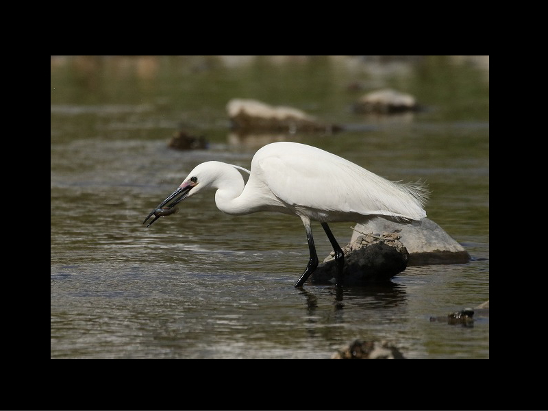 ハゼ類(ヨシノボリ?)を盛んに捕食。飾り羽やきれいな婚姻色を持つ個体だった。