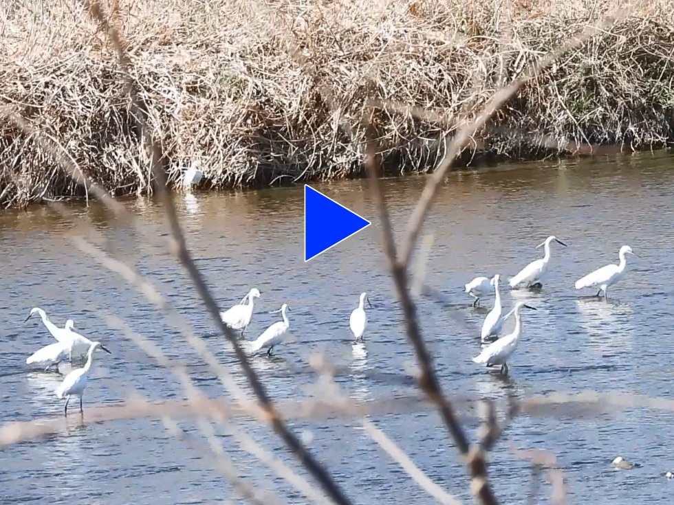 コサギ 30羽前後が川底を突っつき、動き回り、集団で漁をしているようであった。カワウ 10羽前後、ダイサギも混じっていた。