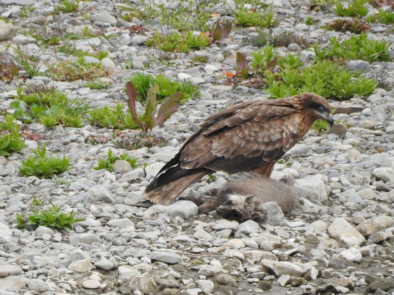 上空から舞い降りたトビがタヌキの死骸を食べていました。