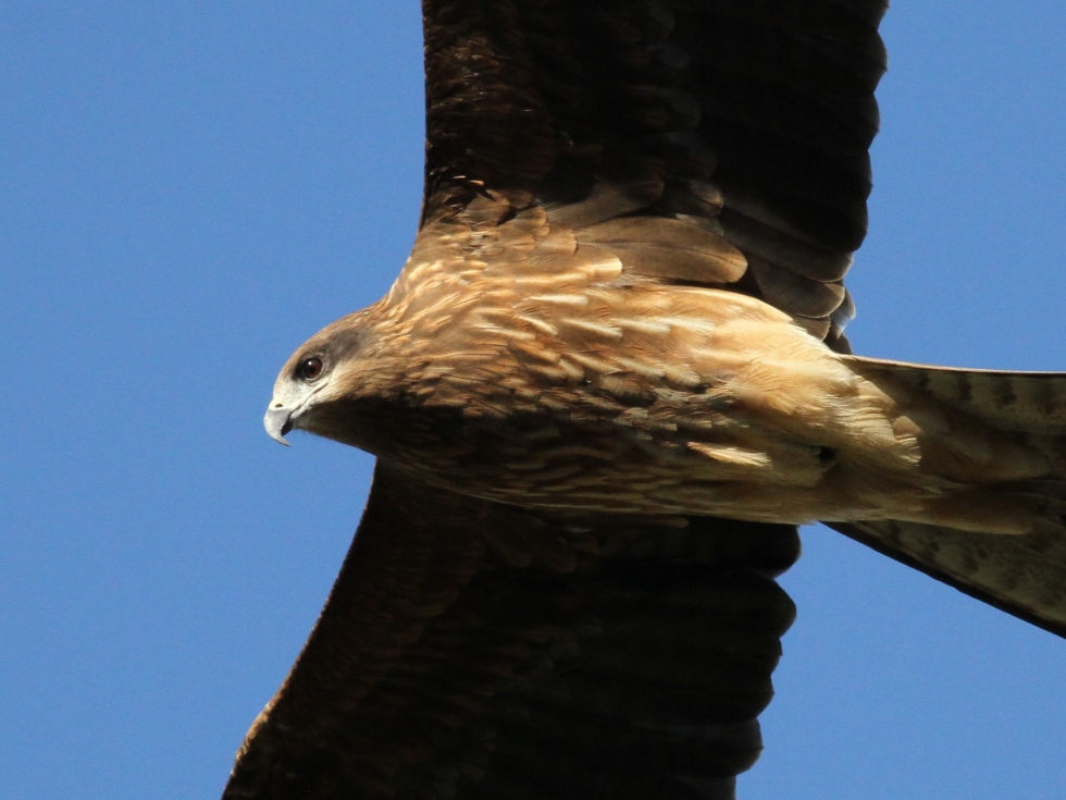 近くを飛んだトビのクローズアップ。さすがにタカの仲間だけあって、眼光とくちばしは鋭い。