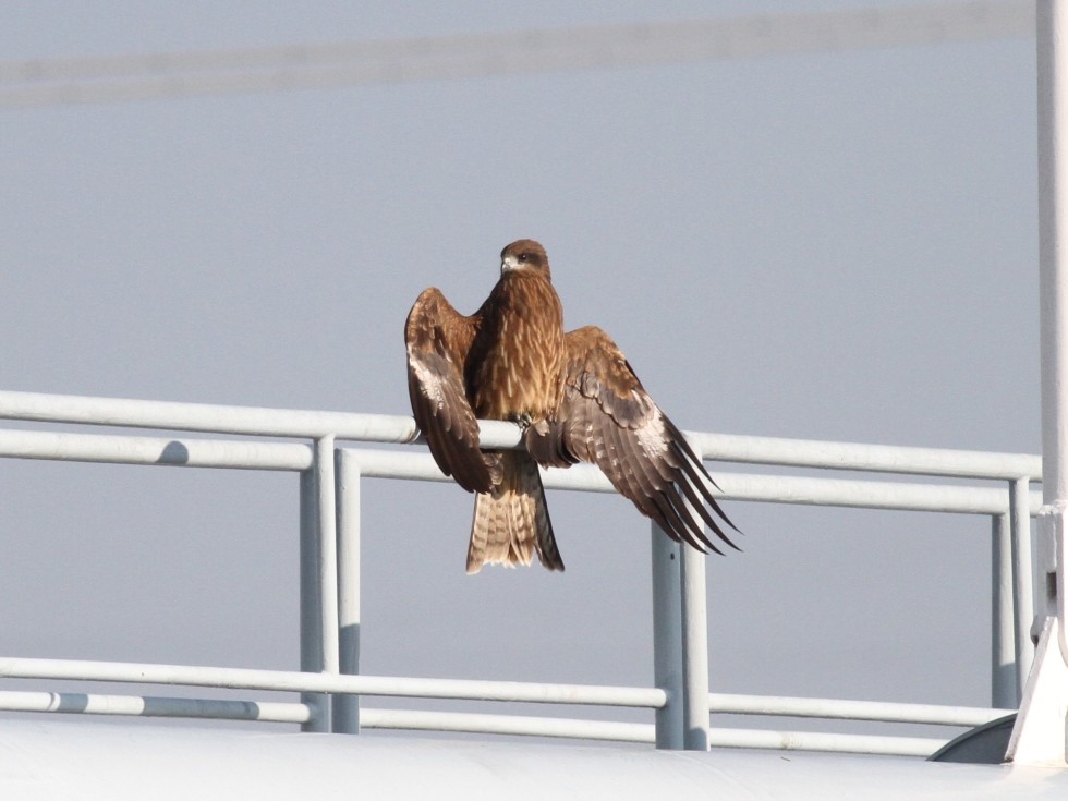 トビが水管橋の上で気持ちよさそうに羽を広げて日光浴していた。