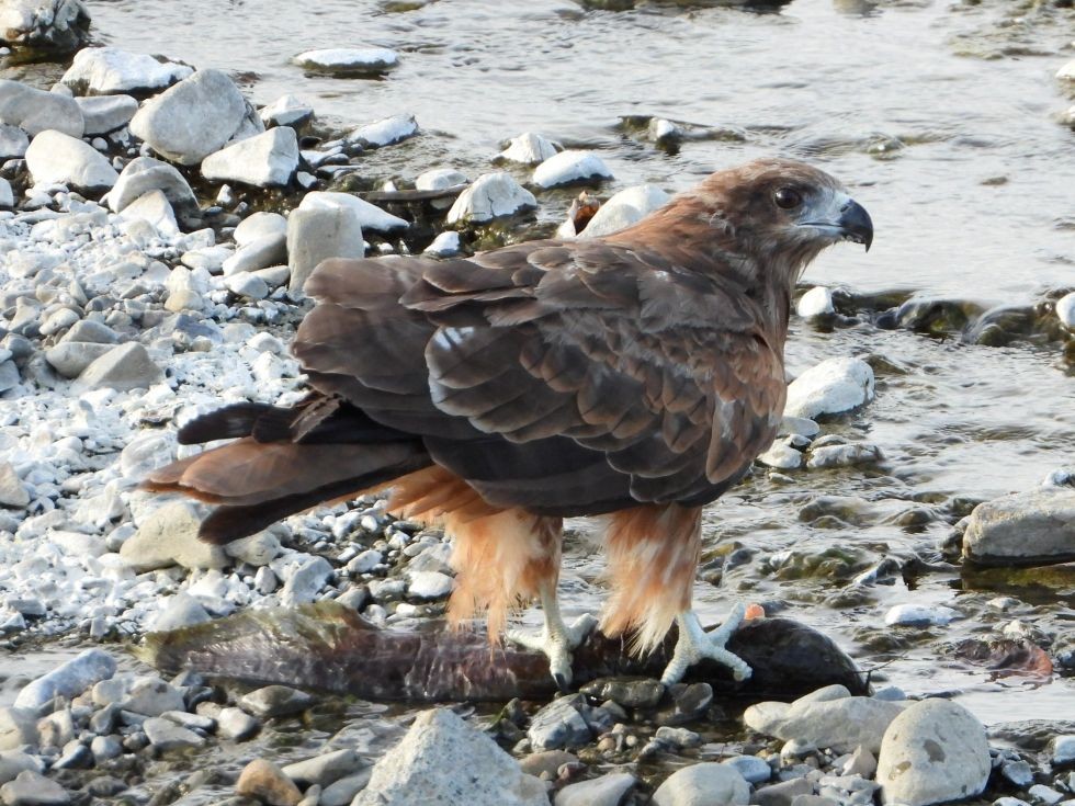 中州で大ナマズを貪っていた。周りにハシボソガラスが2羽いて、隙をついて横取りしようとするが簡単に蹴散らして独り占め。上空ではカラスに追われるシーンをよく見るが、地上では体格に勝るトビが優勢だった。