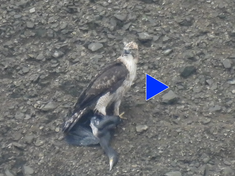 タカの渡り調査の城山湖で、クマタカがカワウを襲った。捕まえた水際から斜面を登りはじめた。重いので、何度も休みながら登っていった。やがて草むらまで運ぶと食べ始めた。1時間半以上食べてから、近くの枝にとまり、飛んだ。 体が重かったのか、すぐ近くの茂みの中に入り、見えなくなった。