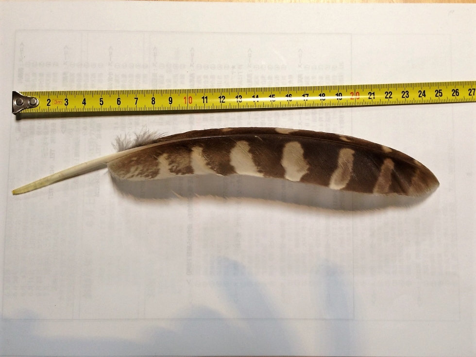 陵東公園の小川を渡り北側に登る遊歩道で珍しい植物(オニノヤガラ)の根元近くで野鳥の羽を発見しました。 調べるとフクロウの初列風切りの可能性が高いようです。