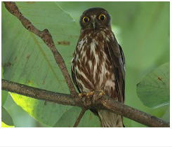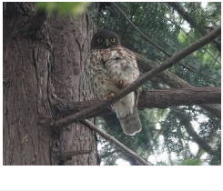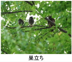 解説:青葉の頃に南から渡ってくるフクロウなので「アオバズク」の名がある。大きな金色の丸い目が印象的である。当地でも、樹洞がある大きな樹木が残る神社やお寺の境内等で繁殖例がある。