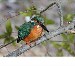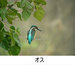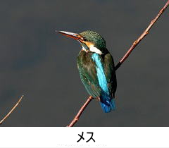 解説:八王子・日野カワセミ会のシンボルであり、「日野市の鳥」でもある。清流の鳥とのイメージがあるが、浅川・多摩川では季節を問わず比較的目にする機会も多い。「チィー」と鳴きながら川面を直線的に飛ぶ姿や空中でホバリングして餌を狙う姿もよく見られる。メスはクチバシの下側が赤く、オスはクチバシ全体が黒いので雌雄の区別がつく。