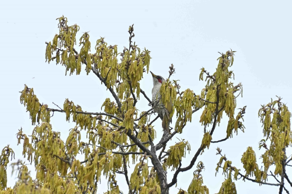 自宅の窓から大きな声でさえずる野鳥の声が聞こえてきたので、近くの林に行ってみるとアオゲラでした。川の反対岸に飛んで行った後も聞こえるくらい、とても大きな声でした。