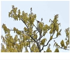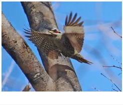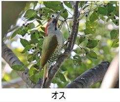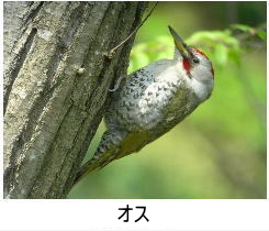 解説:当地ではコゲラと並んで代表的なキツツキであり、日本固有種でもある。小宮公園や長沼公園などの雑木林や山麓の林のほか河畔林などでも観察されることがある。鋭い声で「キョッキョッ」と鳴くので、周囲の樹上を探すと大抵見つけることができる。オスは前頭部から後頭部にかけてと顎線の一部に赤い部分があるが、メスの前頭部は赤くないので識別ができる。