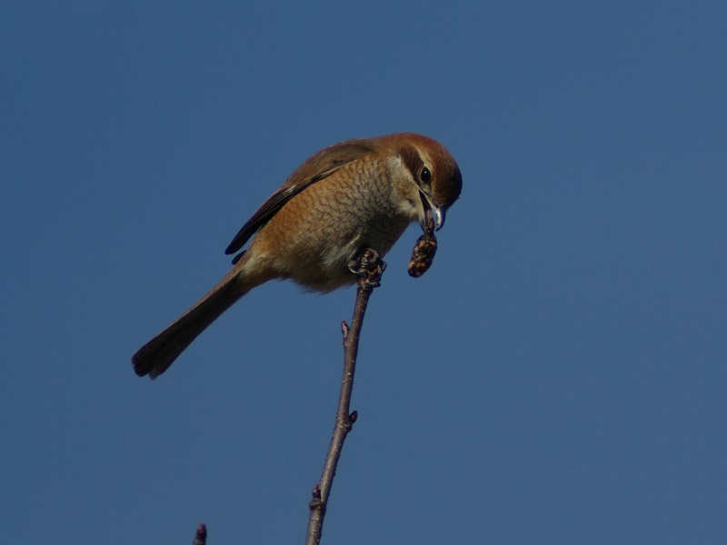 枝先に止まっていたモズが大きく口をあけたと思ったら、ペリットを吐き出した。