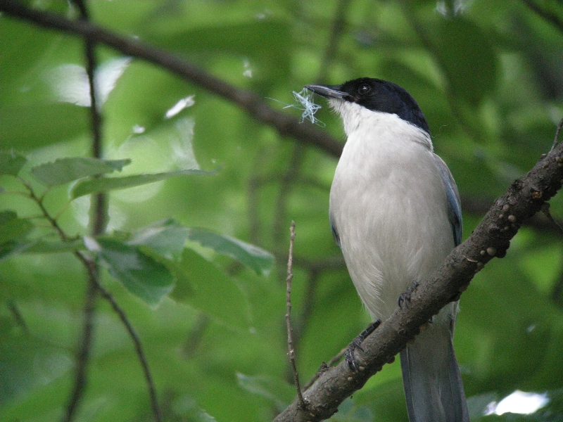 糸のようなものをくわえたオナガ。巣の産座にでもするのだろうか。