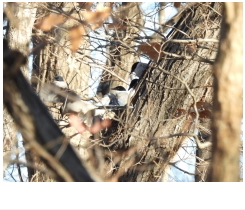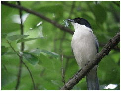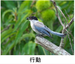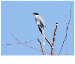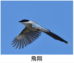 解説:当地では留鳥として通年見られる。名前の通り、体の半分近くを占める長い尾が特徴である。黒い頭に水色の羽をもつ、なかなかきれいな鳥であるが、カラスの仲間で「グェーィ」などと濁った声で鳴く。群れを作り市街地近くでも見られる。飛ぶときは次々に数羽が飛ぶ習性がある。