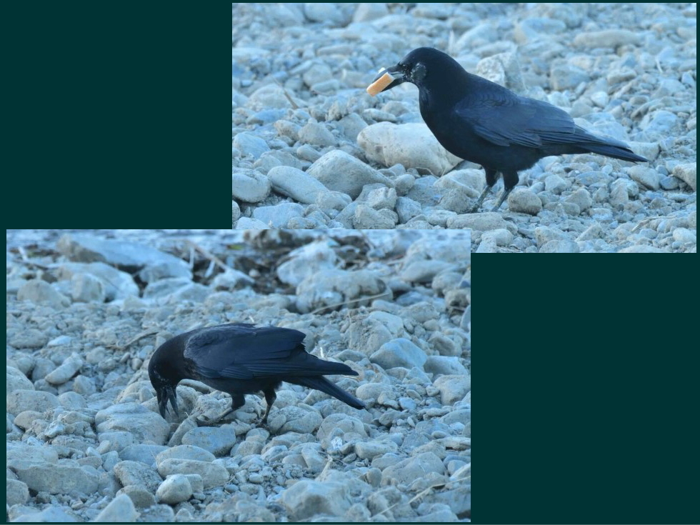 食パンを拾ってきたハシボソガラスが、浅川の砂礫の隙間にそれを隠し、さらに石を2つ3つ上から置いて隠していました。