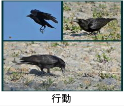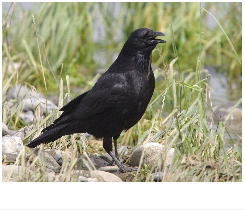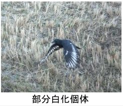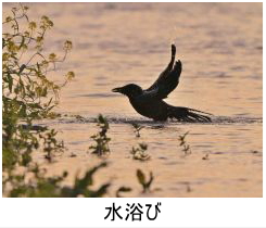 解説:当地で普通に見られるカラスは、「ハシブトガラス」と「ハシボソガラス」の2種類である。一見すると区別がつきにくいが、鳴き声(ハシブト:「カーカー」澄んだ声が多い、ハシボソ:「ガーガー」濁った声)、額の形(ハシブト:おでこの毛が盛り上がっていることが多い、ハシボソ:盛り上がり少ない)、クチバシの形(ハシブト:太く大きく湾曲、ハシボソ:やや細く湾曲少ない)、鳴く時の姿勢(ハシブト:尾を上下に動かす、ハシボソ:頭を上下に動かす)、などの違いがある。