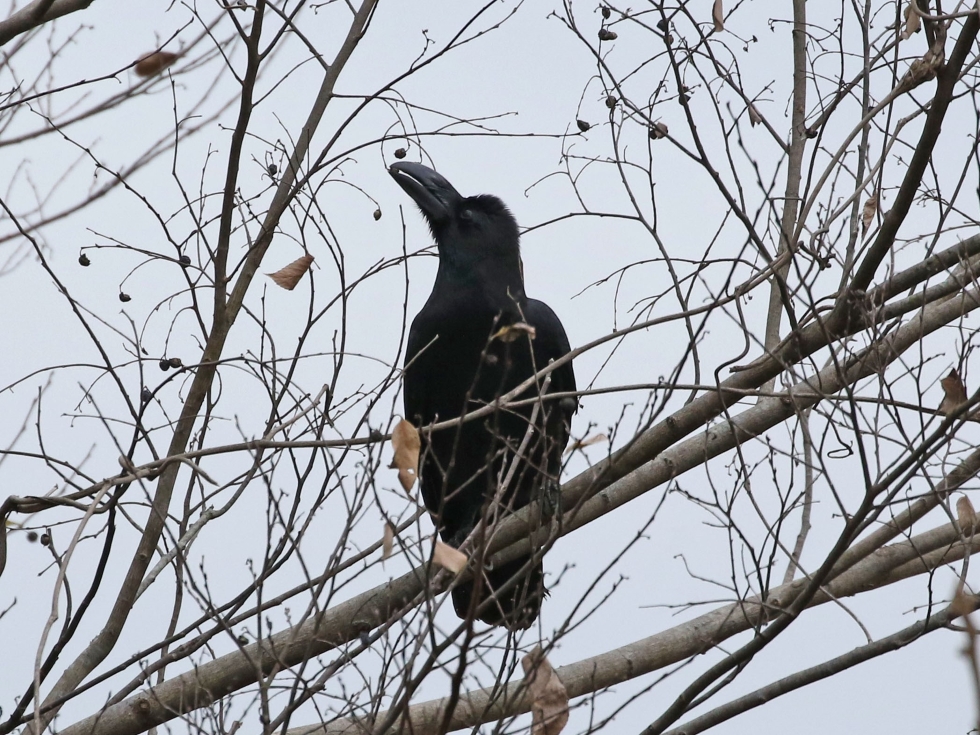 大きな嘴で小さな木の実(エノキ)を器用についばんでいました。
