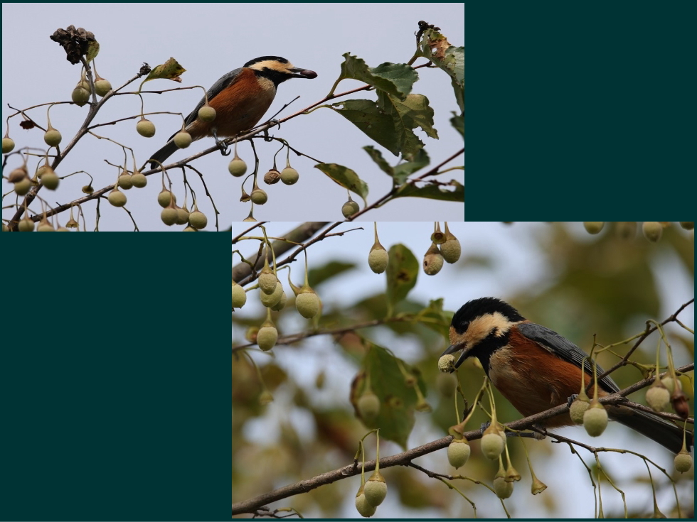エゴノキの実が多少熟したためか、複数のヤマガラが頻繁にやって来ます。食べたい中心部分の種は、周りの果肉を取り去る必要がありますが、その場で種を取り出すヤマガラと近くの電線の上で行うヤマガラがいます。