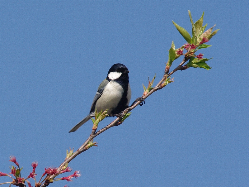 花の咲き終わった桜の枝にとまるシジュウカラ。 オスは胸のネクタイが太い。
