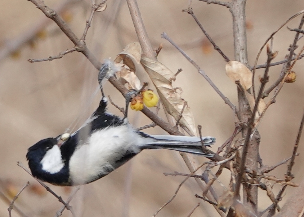 シジュウカラがソシンロウバイの花が咲いている木に飛び込んだ。花を食べるのかとみていると宙返り、蜘蛛の卵包を咥えていた。