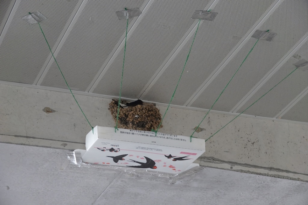 巣の中の雛が襲われないようにカラス対策をしたツバメの巣です。巣の周りに紐を張ったもの。