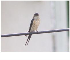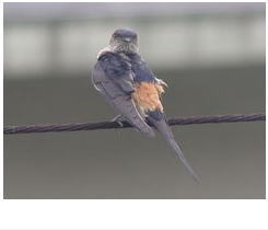 解説:夏鳥として当地を訪れるが、ツバメよりもかなり遅く、5月初め頃に姿を見せる。当地での分布は局所的であり、数は多くない。徳利を半分に割って天井に張り付けたような形の巣をつくる。ツバメよりやや大きく、名前のとおり腰が赤く、体下面は縦斑が目立つ。喉は赤くない。