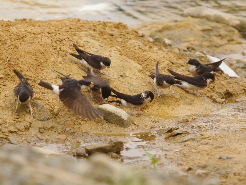 大和田橋下はイワツバメの大規模な集団営巣地である。 付近の川辺ではイワツバメが巣作りのために泥をとっていた。