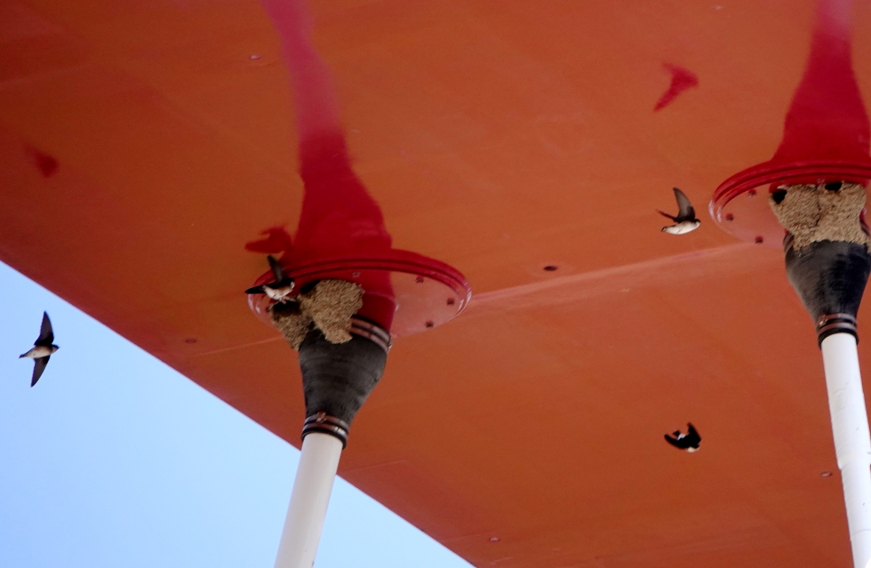 今年も多摩大橋のアーチのワイヤー取り付け部にたくさんの巣が掛けられ、イワツバメが飛び交っていた。下流側から見えただけで13個の巣があった。
